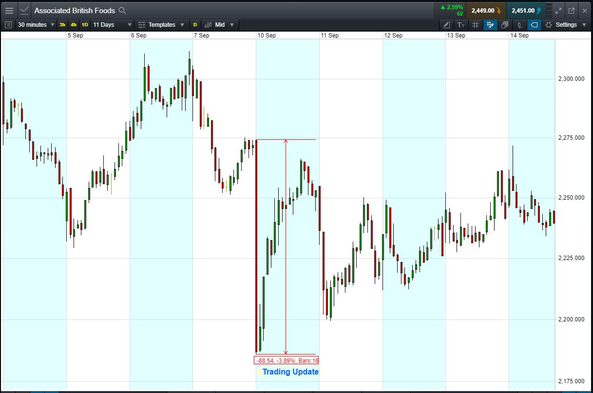 - The chart shows the price movement last time AB Foods reported: Trading Update, 10 September.