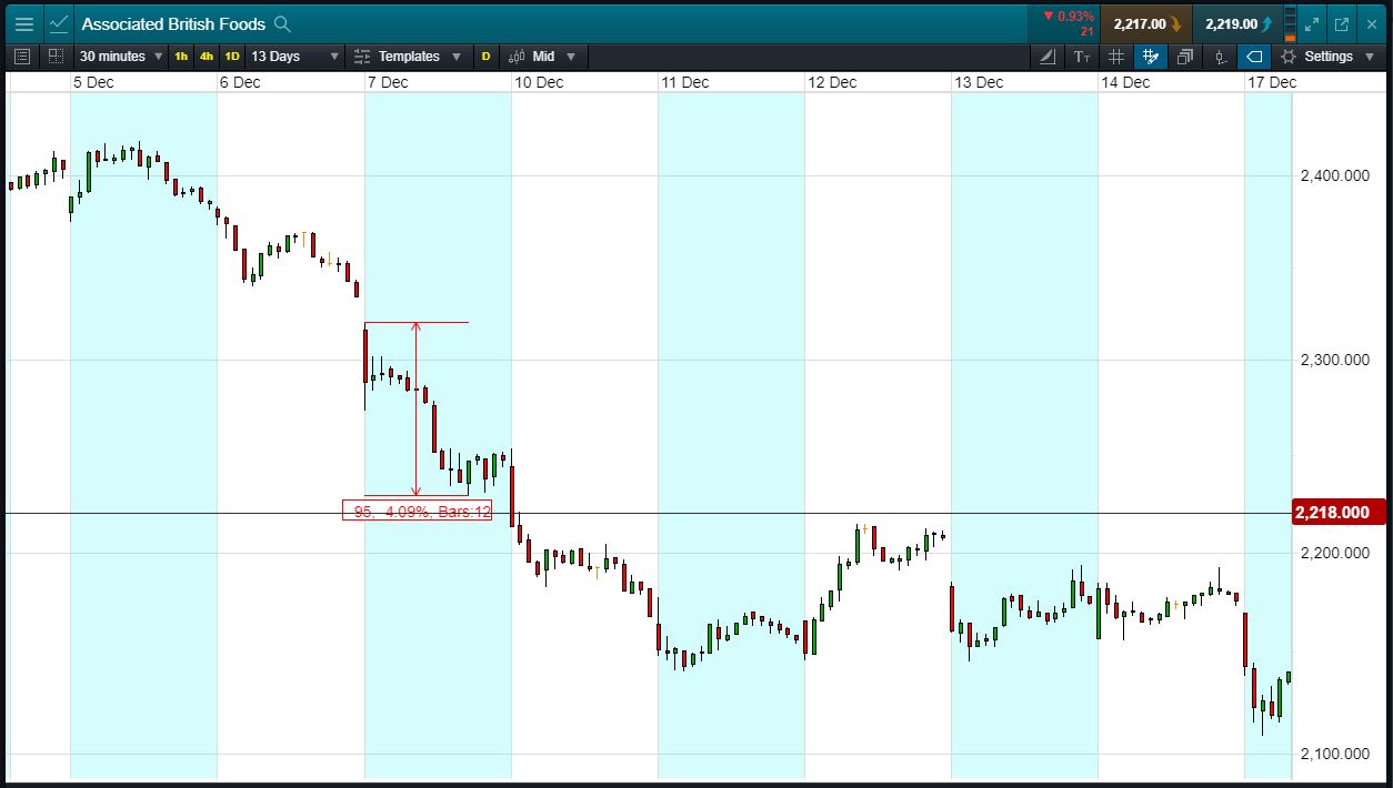 Conversely, let’s assume you open the position, and place a stop-loss 5% below the current price. AB Foods results miss, it falls 5% and hits your stop-loss. Your loss would be £500.