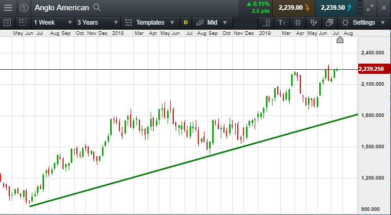 Let’s say you think that Anglo American results are likely to be good, and the share price is likely to rise. You decide to buy exposure to £10,000 worth of Anglo American using CFDs, at the current price of 2241. To do this, you need £2,000.