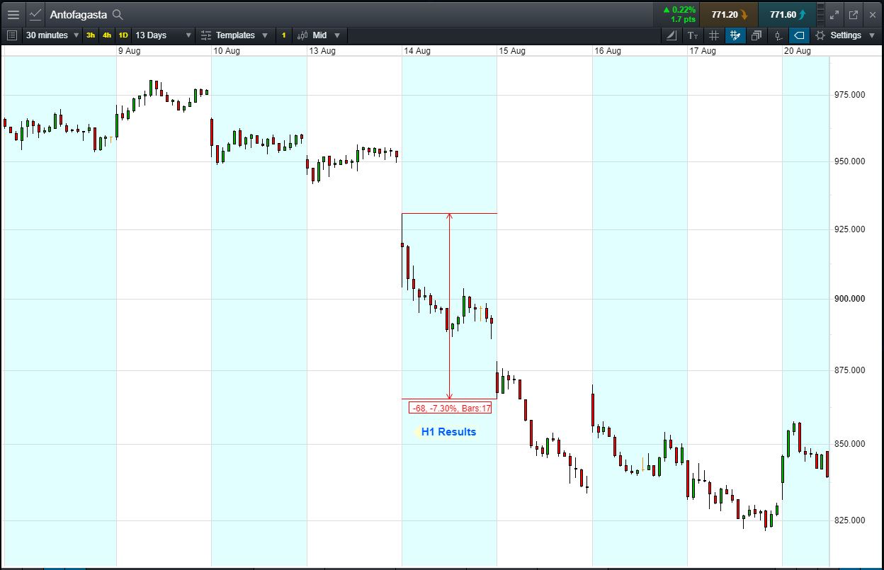 - The chart shows the price movement last time Antofagasta reported: H1 Results, 14 Aug.
