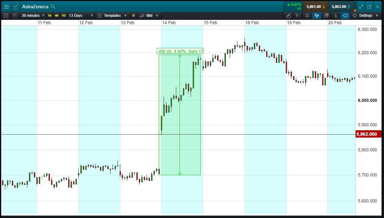 Let’s say you think that AstraZeneca results are likely to be good, and the share price is likely to rise. You decide to buy exposure to £10,000 worth of AstraZeneca using CFDs, at the current price of 5856p. To do this, you need £2,000.
