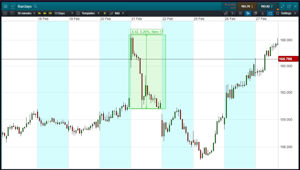 Let’s say you think that Barclays results are likely to be good, and the share price is likely to rise. You decide to buy exposure to £10,000 worth of Barclays using CFDs, at the current price of 165p. To do this, you need £2,000.