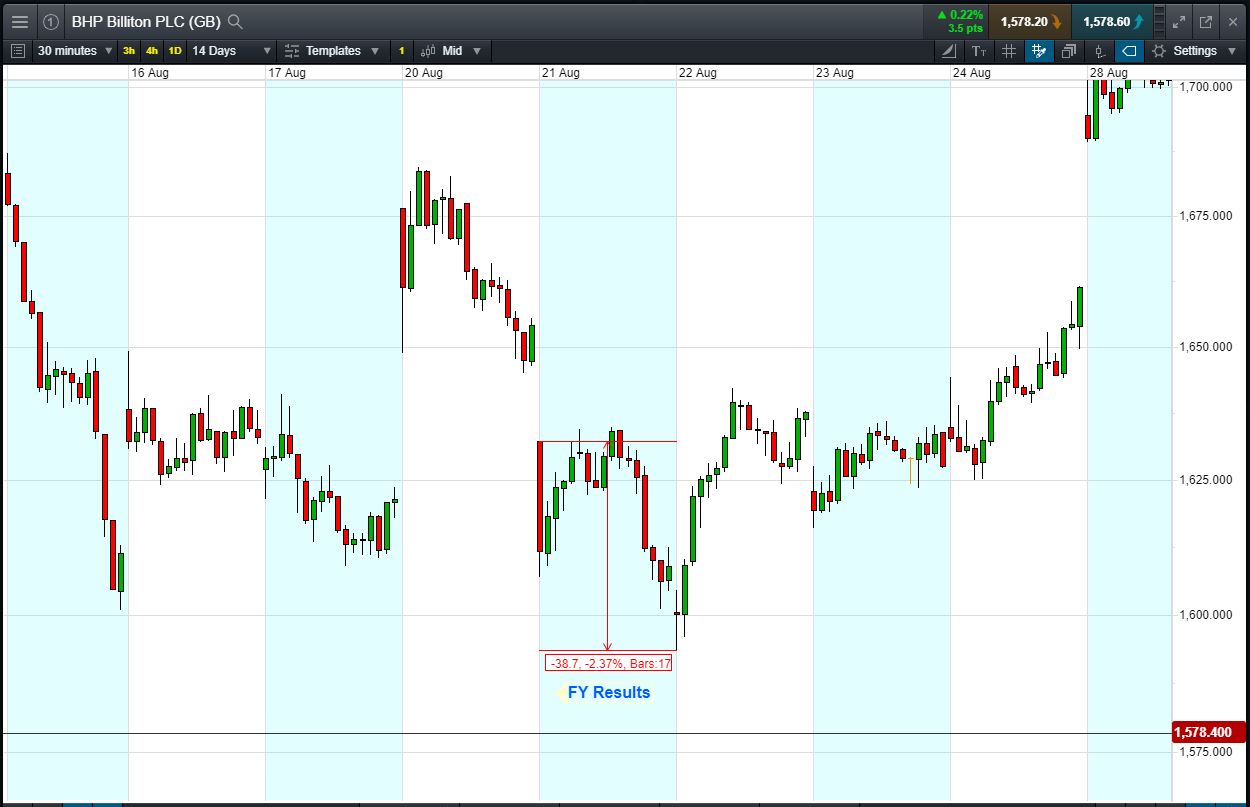- The chart shows the price movement last time BHP Billiton reported: full-year results, 21 Aug.