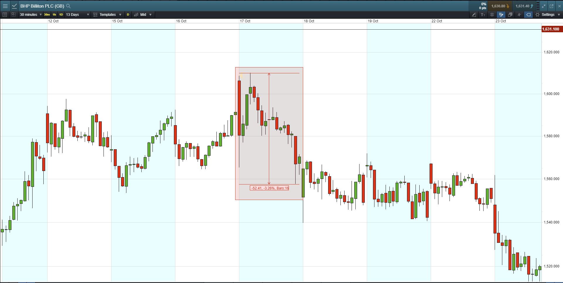 Let’s say you think that BHP results are likely to be good, and the share price is likely to rise. You decide to buy exposure to £10,000 worth of BHP using CFDs, at the current price of 1617p. To do this, you need £2,000.