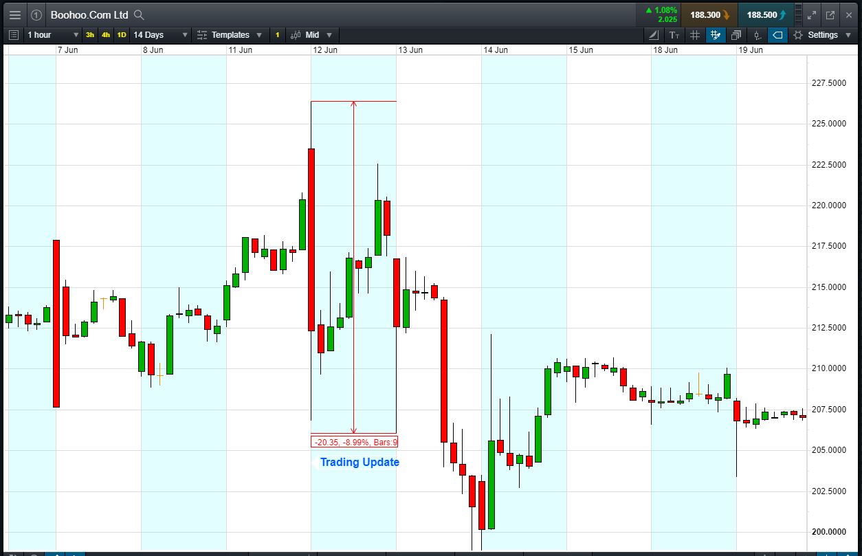 • The chart shows the price movement last time Boohoo reported (12 June).