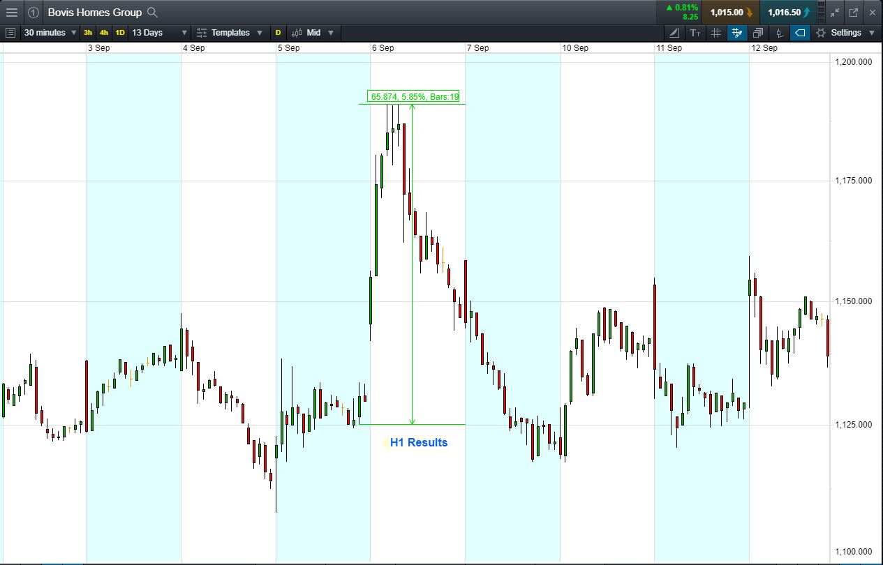 - The chart shows the price movement last time Bovis Homes reported: H1 Results, 6 Sept.