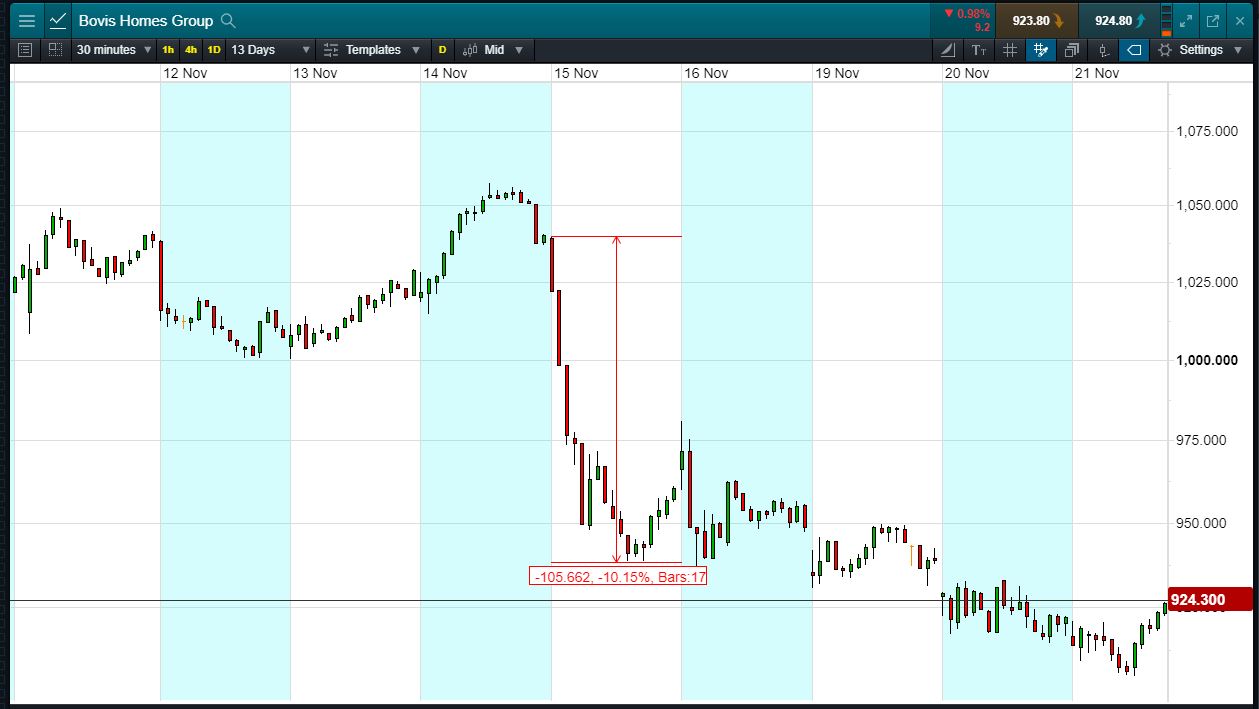 - The chart shows the price movement last time Bovis Homes reported: Q3 Trading, 15 Nov.