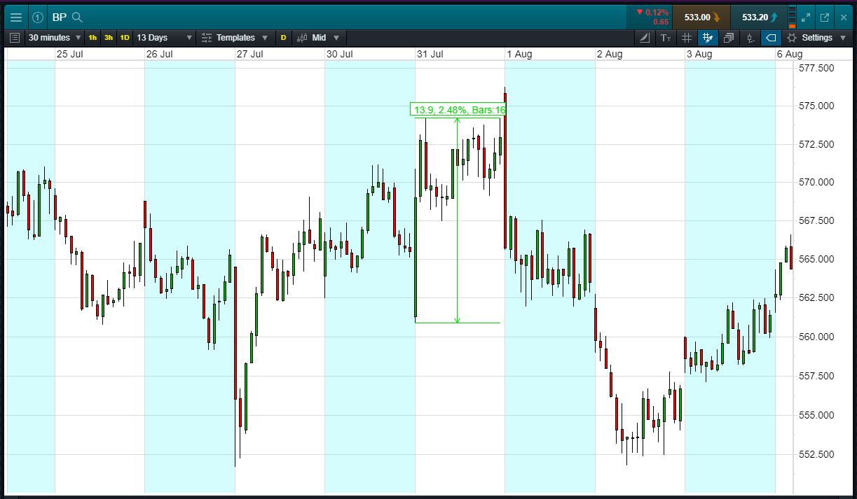 - The chart shows the price movement last time BP reported: Q2 Results, 31 Jul.