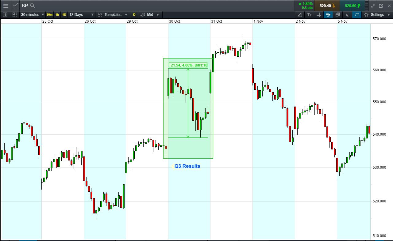 Let’s say you think that BP results are likely to be good, and the share price is likely to rise. You decide to buy exposure to £10,000 worth of BP using CFDs, at the current price of 523p. To do this, you need £2,000.