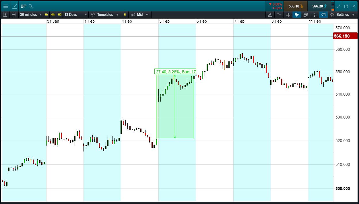 Let’s say you think that BP results are likely to be good, and the share price is likely to rise. You decide to buy exposure to £10,000 worth of BP using CFDs, at the current price of 566p. To do this, you need £2,000.