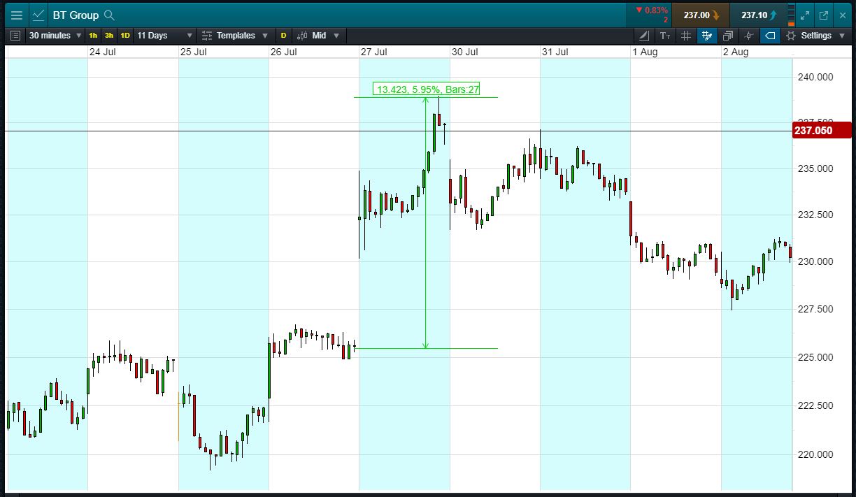 - The chart shows the price movement last time BT reported: Q1 Trading Update, 27 July.