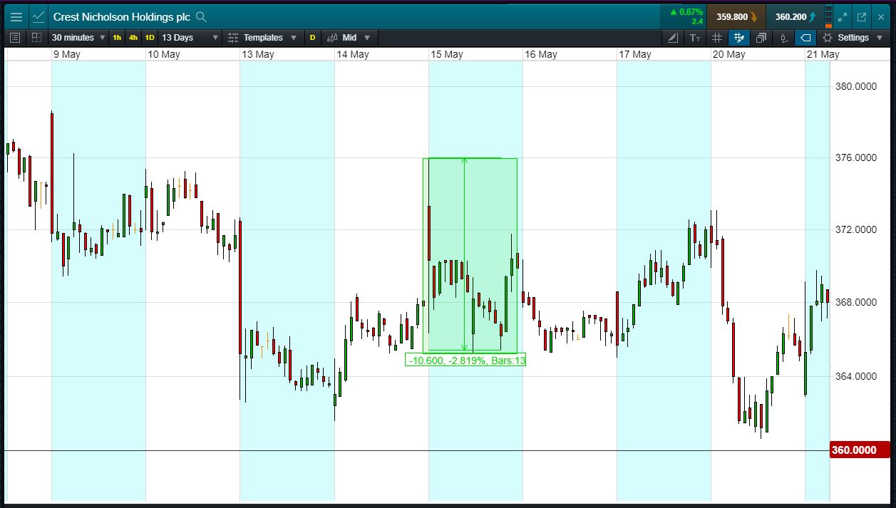 Let’s say you think that Crest Nicholson results are likely to be good, and the share price is likely to rise. You decide to buy exposure to £10,000 worth of Crest Nicholson using CFDs, at the current price of 360p. To do this, you need £2,000.