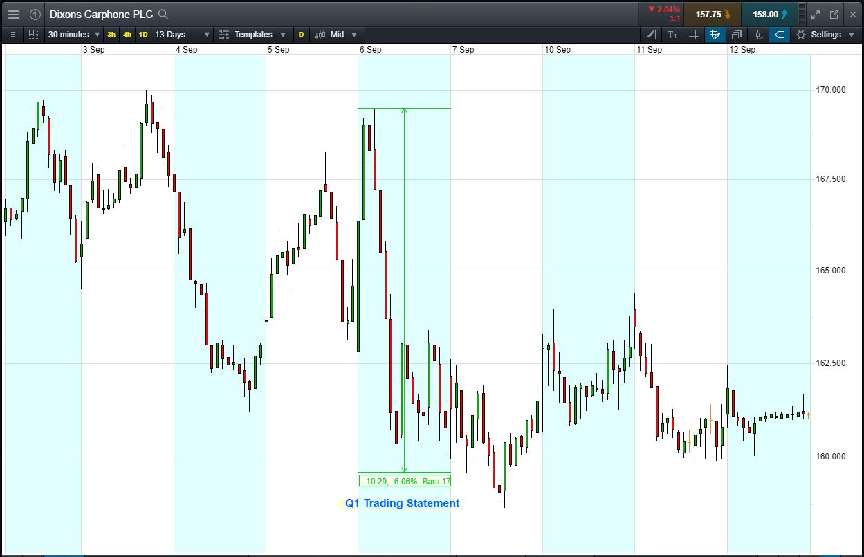 - The chart shows the price movement last time Dixons Carphone reported (Q1 Trading Update, 6 Sept).