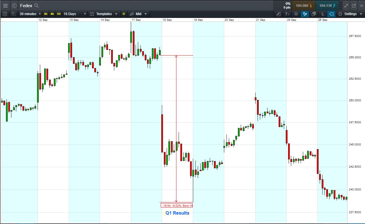 - The chart shows price movements last time FedEx reported (Q1 Results, 17 Sept, after market hours).