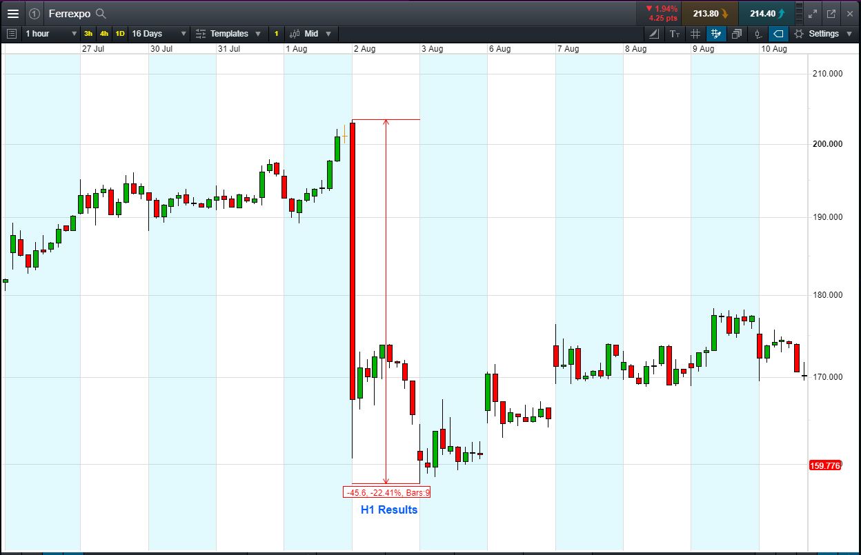 - The chart shows the price movement last time Ferrexpo reported (2 August).