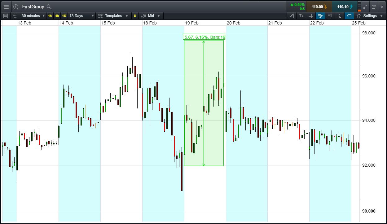Let’s say you think that FirstGroup results are likely to be good, and the share price is likely to rise. You decide to buy exposure to £10,000 worth of FirstGroup using CFDs, at the current price of 109.3p. To do this, you need £2,000.