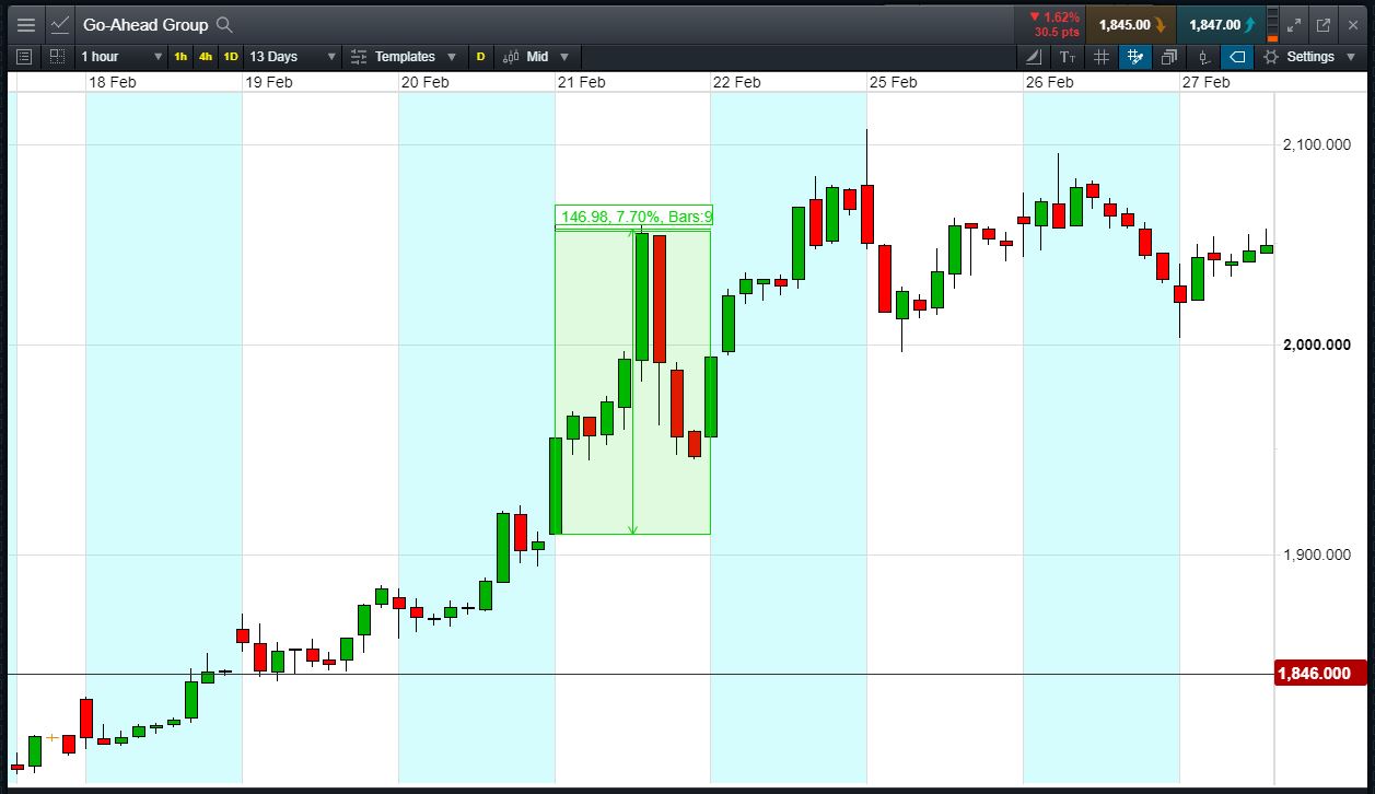 Let’s say you think that Go-Ahead results are likely to be good, and the share price is likely to rise. You decide to buy exposure to £10,000 worth of Go-Ahead using CFDs, at the current price of 1846p. To do this, you need £2,000.