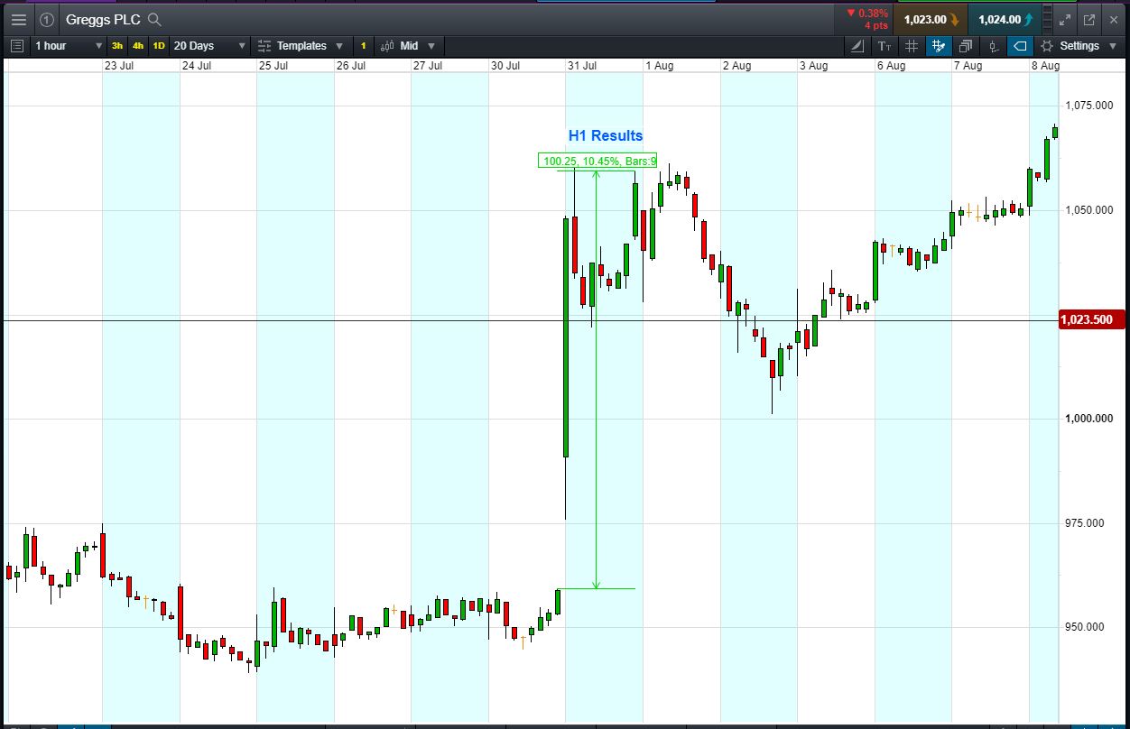 - The chart shows the price movement last time Greggs reported (31 July).
