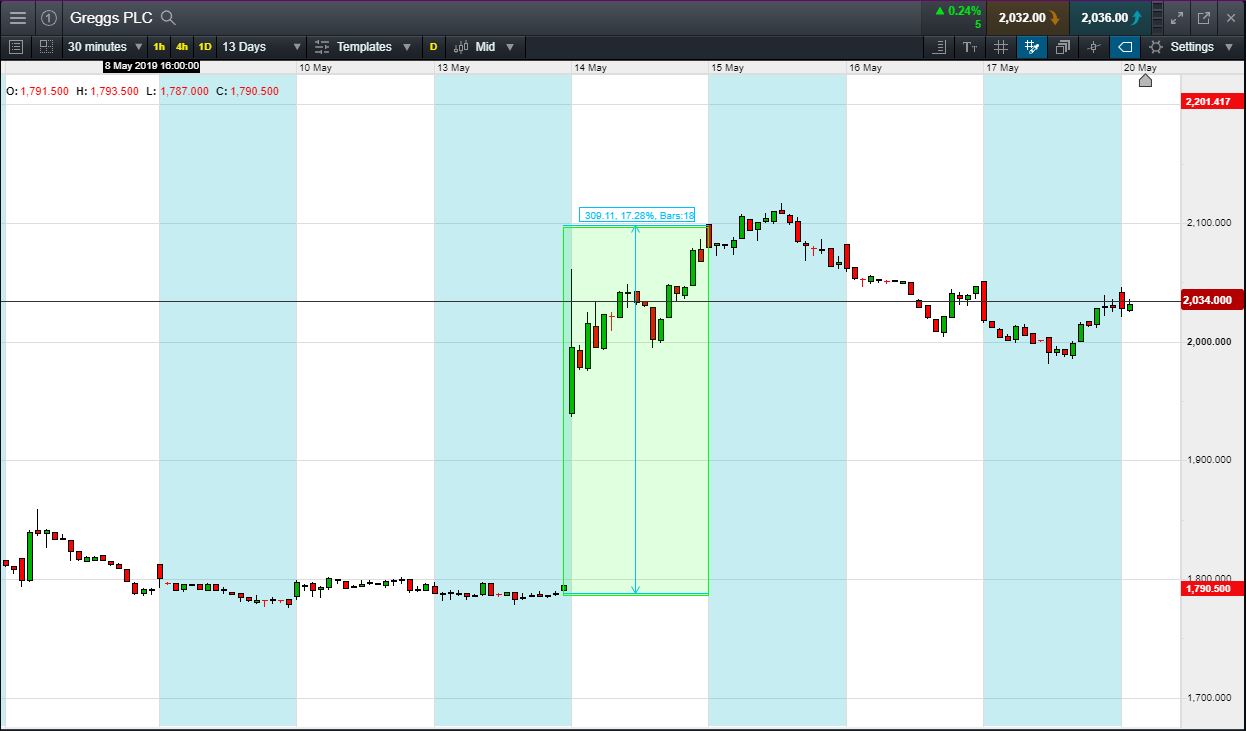 Let’s say you think that Greggs results are likely to be good, and the share price is likely to rise. You decide to buy exposure to £10,000 worth of Greggs using CFDs, at the current price of 2034p. To do this, you need £2,000.