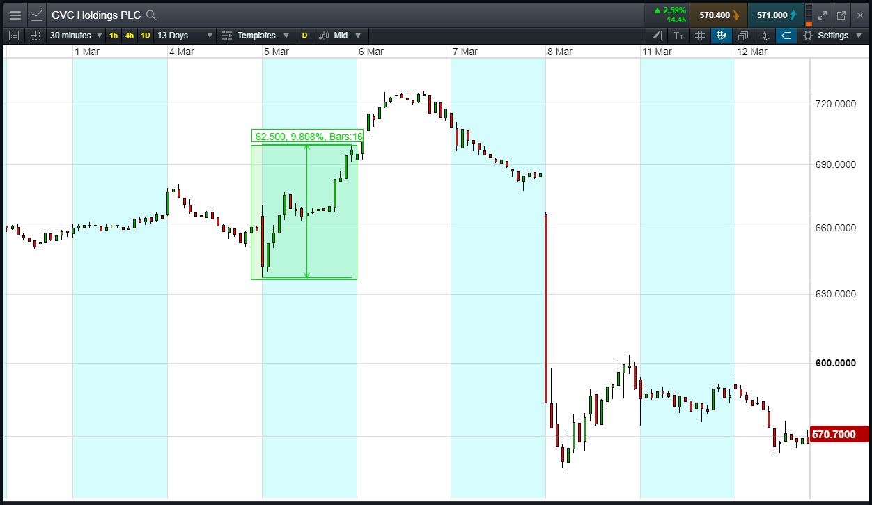 Let’s say you think that GVC results are likely to be good, and the share price is likely to rise. You decide to buy exposure to £10,000 worth of GVC using CFDs, at the current price of 571p. To do this, you need £2,000.