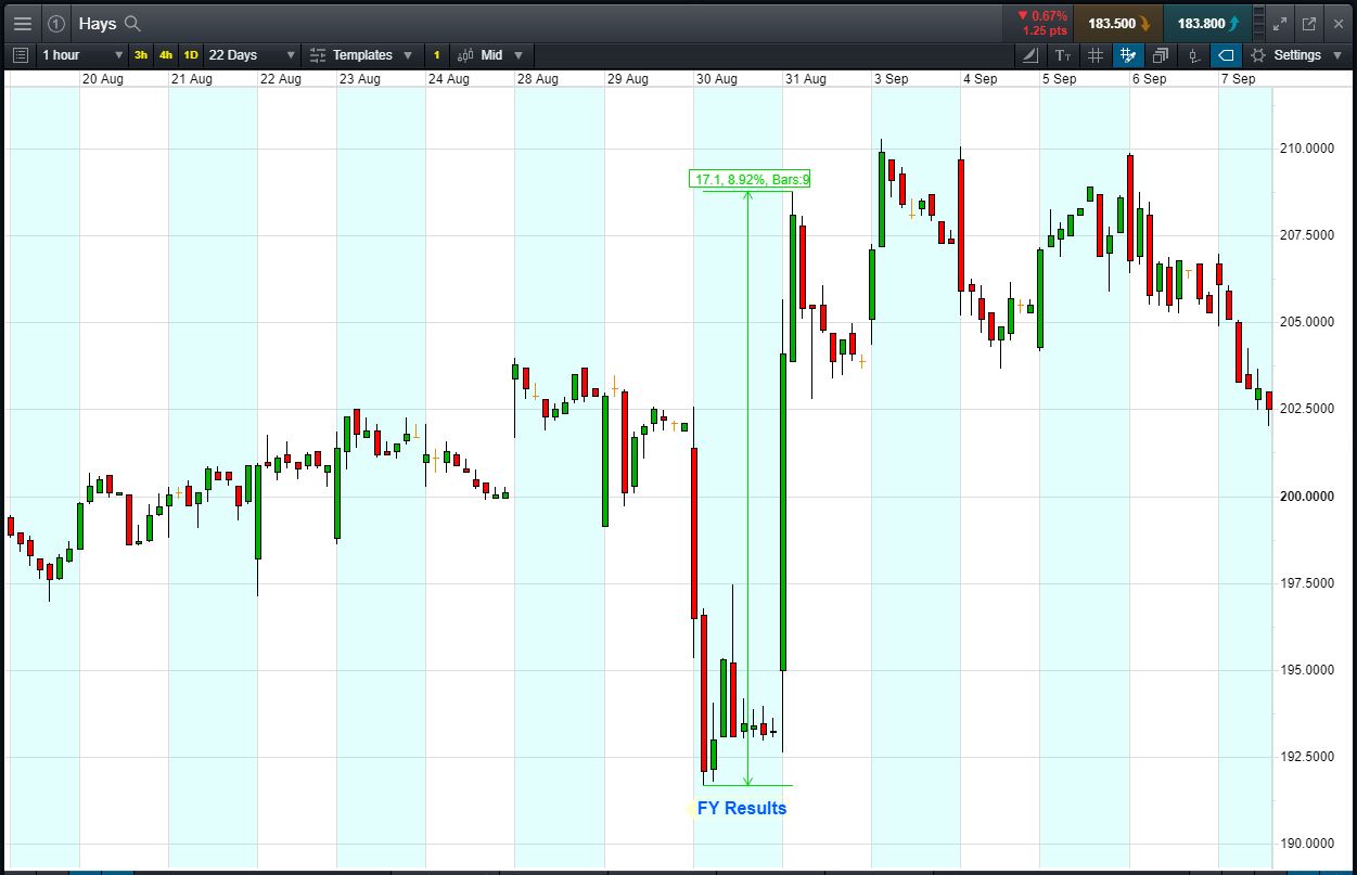 - The chart shows the price movement last time Hays reported full-year results (30 August).