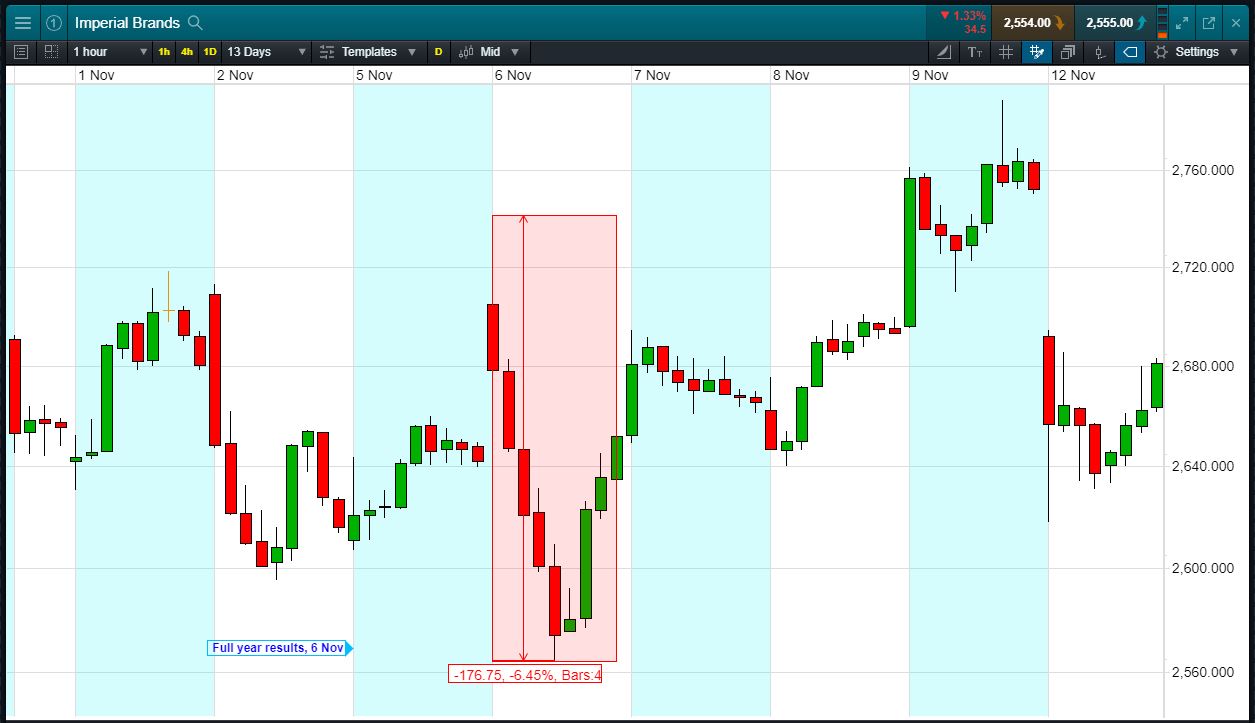 Conversely, let’s assume you open the position, and place a stop-loss 3% below the current price. Imperial Brands results miss, it falls 3% and hits your stop-loss. Your loss would be £300.