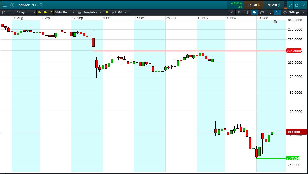 Let’s say you think that Indivior’s message is likely to be good, and the price is likely to rise. You decide to buy exposure to £10,000 worth of Indivior using a CFD, at the current price of 97.5p. To do this, you need £2,000.