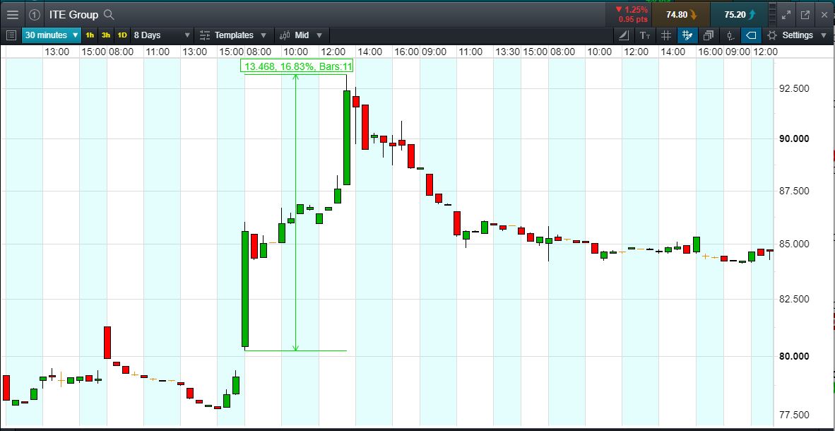Let’s say you think that ITE results are likely to be good, and the share price is likely to rise. You decide to buy exposure to £10,000 worth of ITE using CFDs, at the current price of 75p. To do this, you need £2,000.