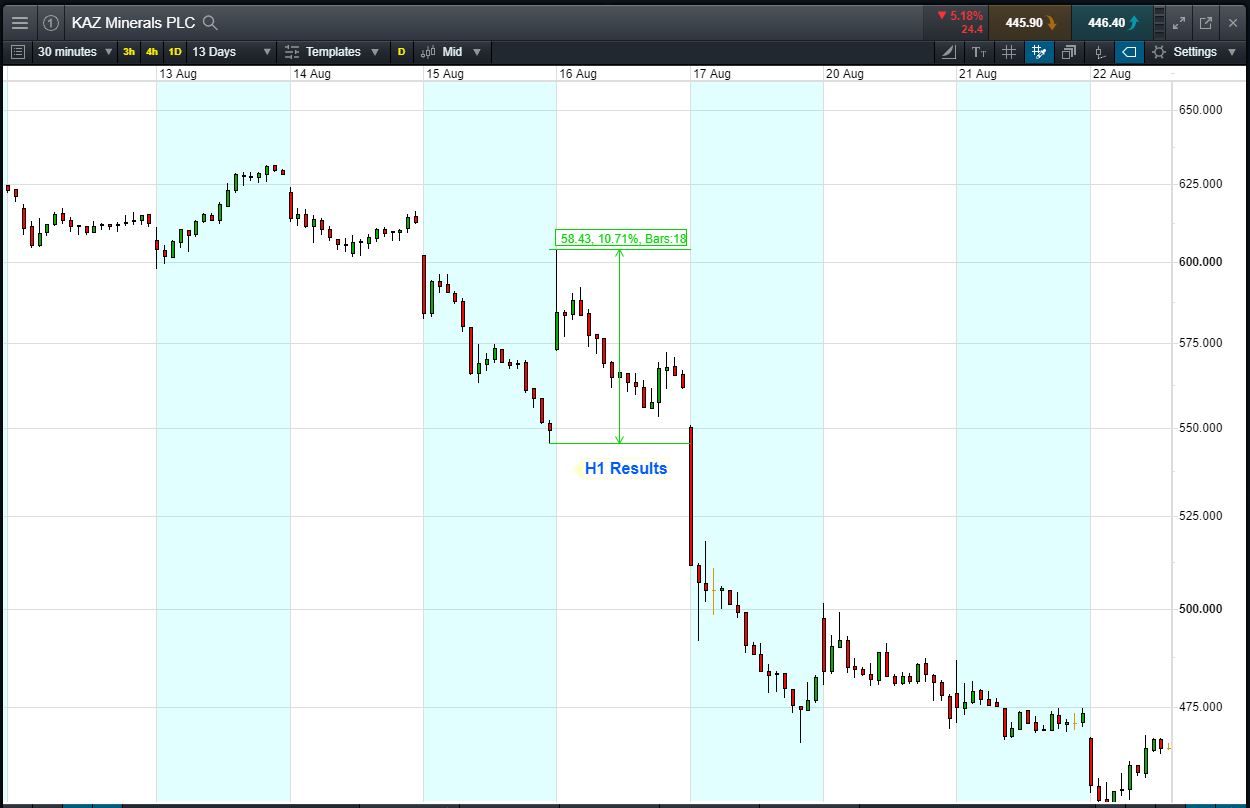 - The chart shows the price movement last time KAZ Minerals reported: H1 Results, 16 Aug.