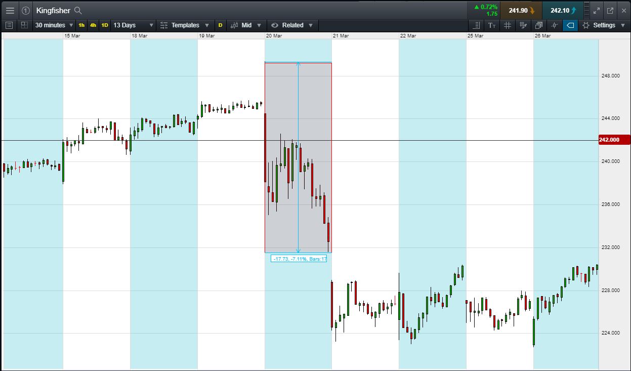 Conversely, let’s assume you open the position, and place a stop-loss 3% below the current price. Kingfisher results miss, it falls 3% and hits your stop-loss. Your loss would be £300.