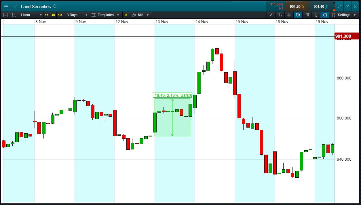 Let’s say you think that Land Securities results are likely to be good, and the share price is likely to rise. You decide to buy exposure to £10,000 worth of Land Securities using CFDs, at the current price of 902p. To do this, you need £2,000.
