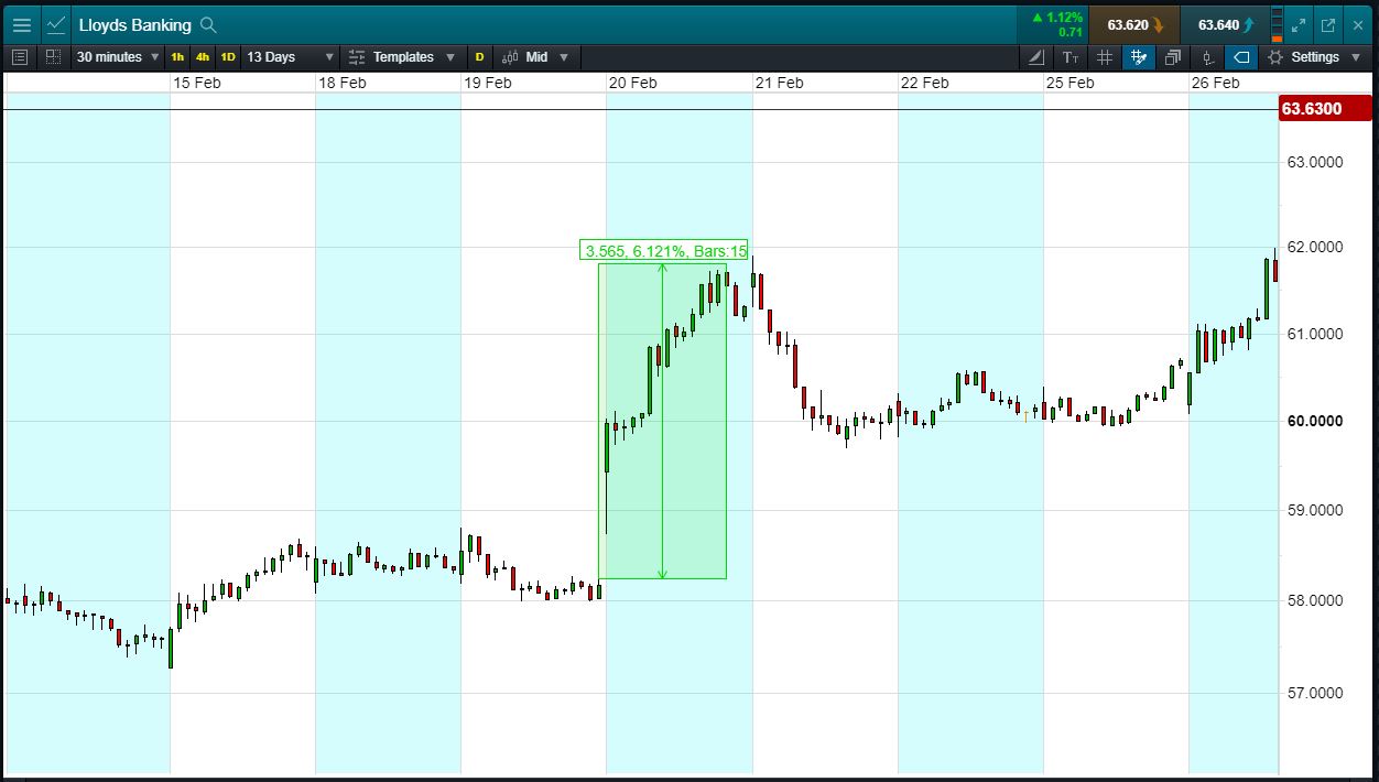 Let’s say you think that Lloyds results are likely to be good, and the share price is likely to rise. You decide to buy exposure to £10,000 worth of Lloyds using CFDs, at the current price of 63.5p. To do this, you need £2,000.