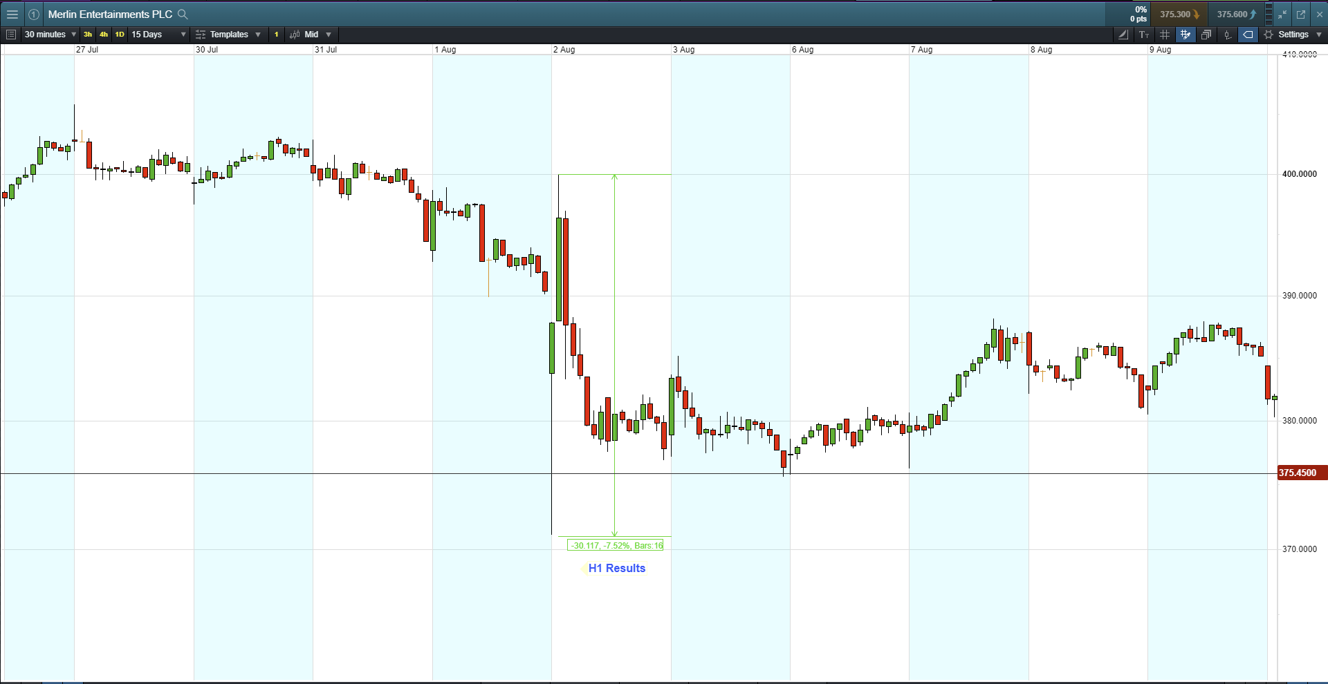 - The chart shows the price movement last time Merlin Entertainments reported: H1 Results, 2 Aug.