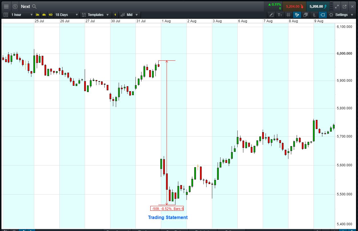 Let’s say you think that Next results are likely to be good, and the share price is likely to rise. You decide to buy exposure to £10,000 worth of Next using CFDs, at the current price of 5,203p. To do this, you need £2,000.