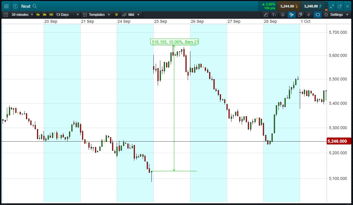 • The shares closed +394p (+7.7%) for a daily range of 172p or 3.4%.