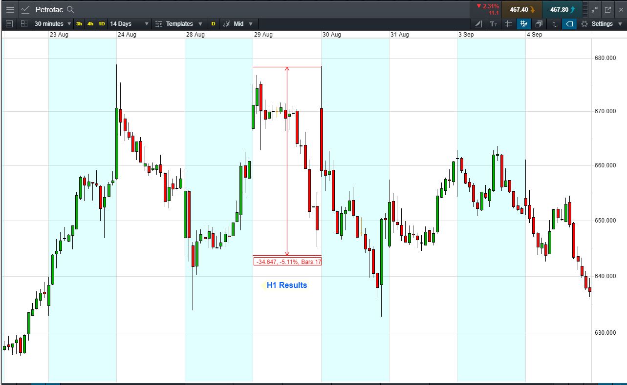 - The chart above shows the price movements last time Petrofac reported (H1 Results, 29 Aug).