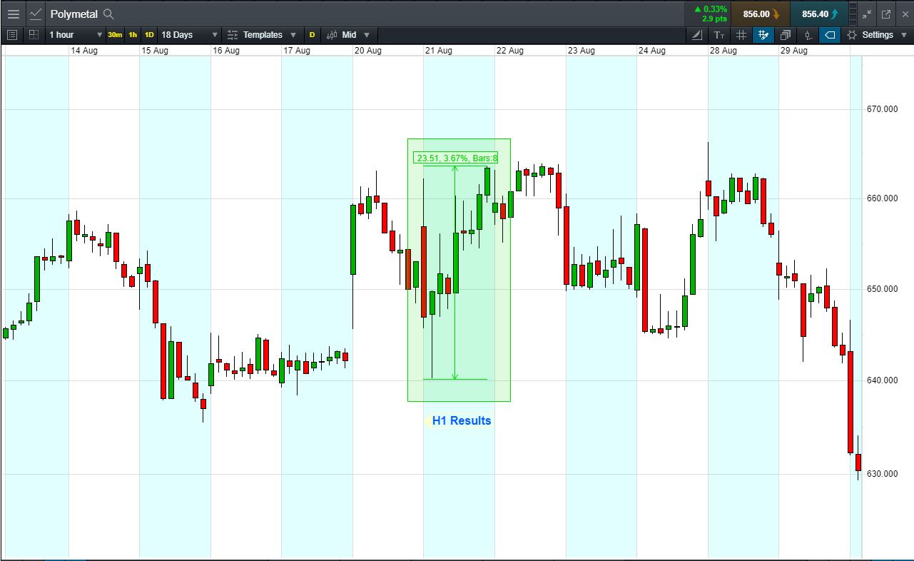 Let’s say you think that Polymetal results are likely to be good, and the share price is likely to rise. You decide to buy exposure to £10,000 worth of Polymetal using CFDs, at the current price of 856p. To do this, you need £2,000.