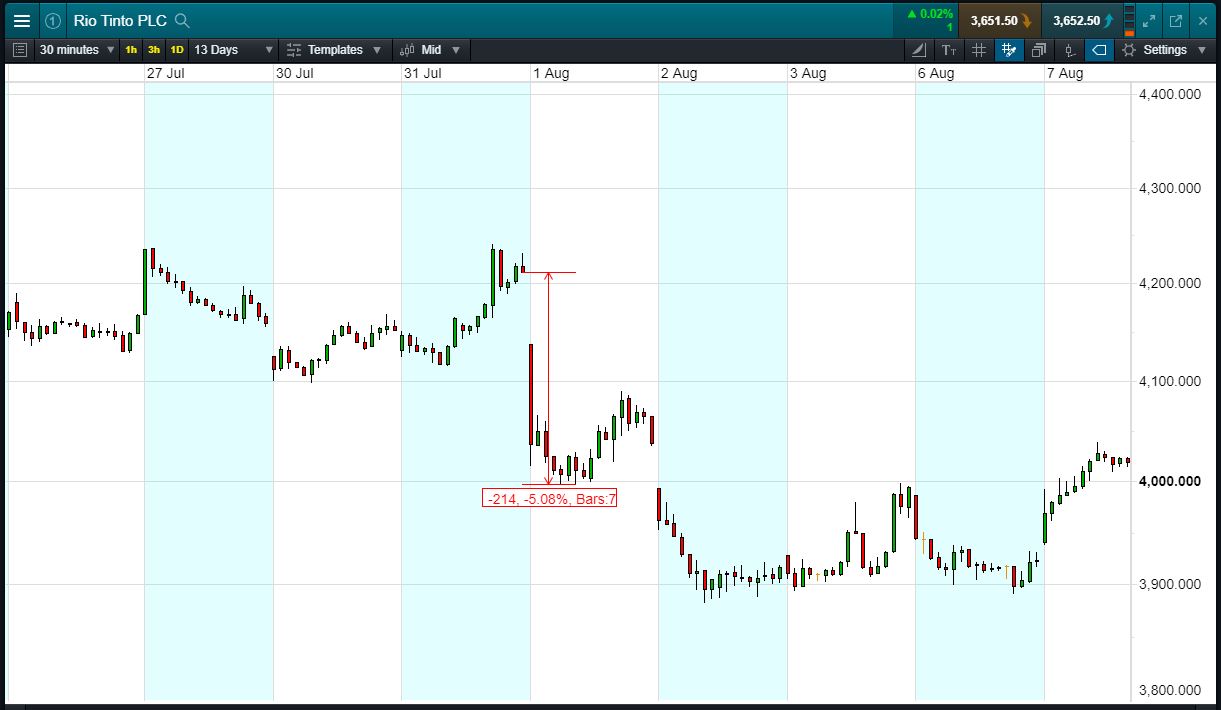 - The chart shows the price movement last time Rio Tinto reported: H1 results, 1 Aug.