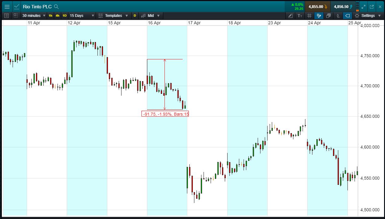 Conversely, let’s assume you open the position, and place a stop-loss 5% below the current price. Rio Tinto results miss, it falls 5% and hits your stop-loss. Your loss would be £500.