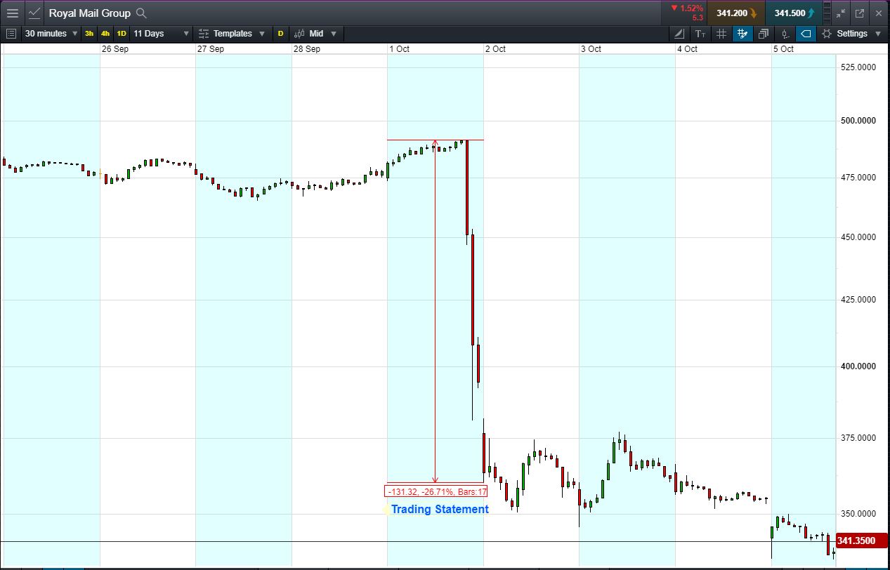 - The chart shows the price movement last time Royal Mail reported: H1 Trading Statement, 1 Oct.