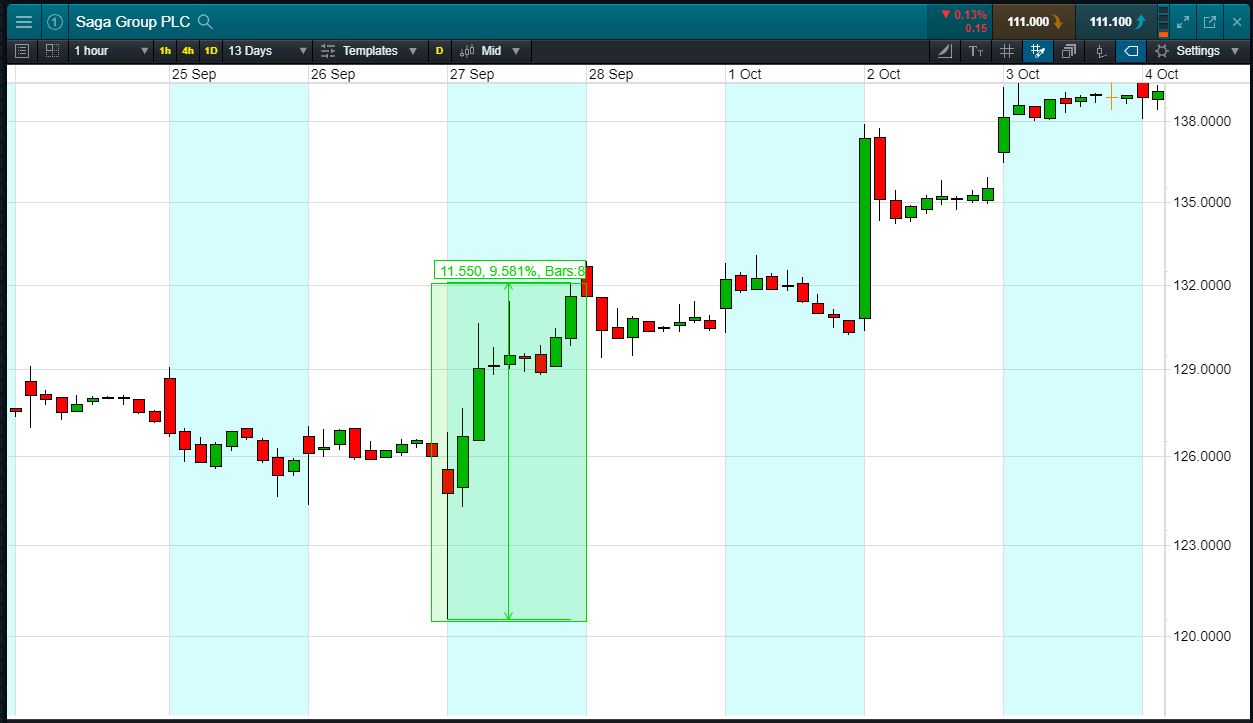Let’s say you think that Saga results are likely to be good, and the share price is likely to rise. You decide to buy exposure to £10,000 worth of Saga using CFDs, at the current price of 110.9p. To do this, you need £2,000.