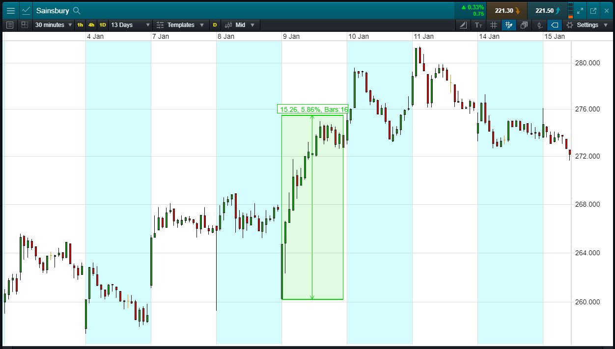 Let’s say you think that Sainsbury results are likely to be good, and the share price is likely to rise. You decide to buy exposure to £10,000 worth of Sainsbury using CFDs, at the current price of 221p. To do this, you need £2,000.
