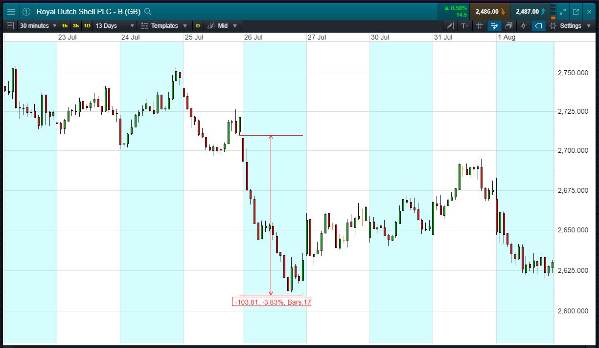 - The chart shows the price movement last time Shell reported: Q2 Results, 26 July.