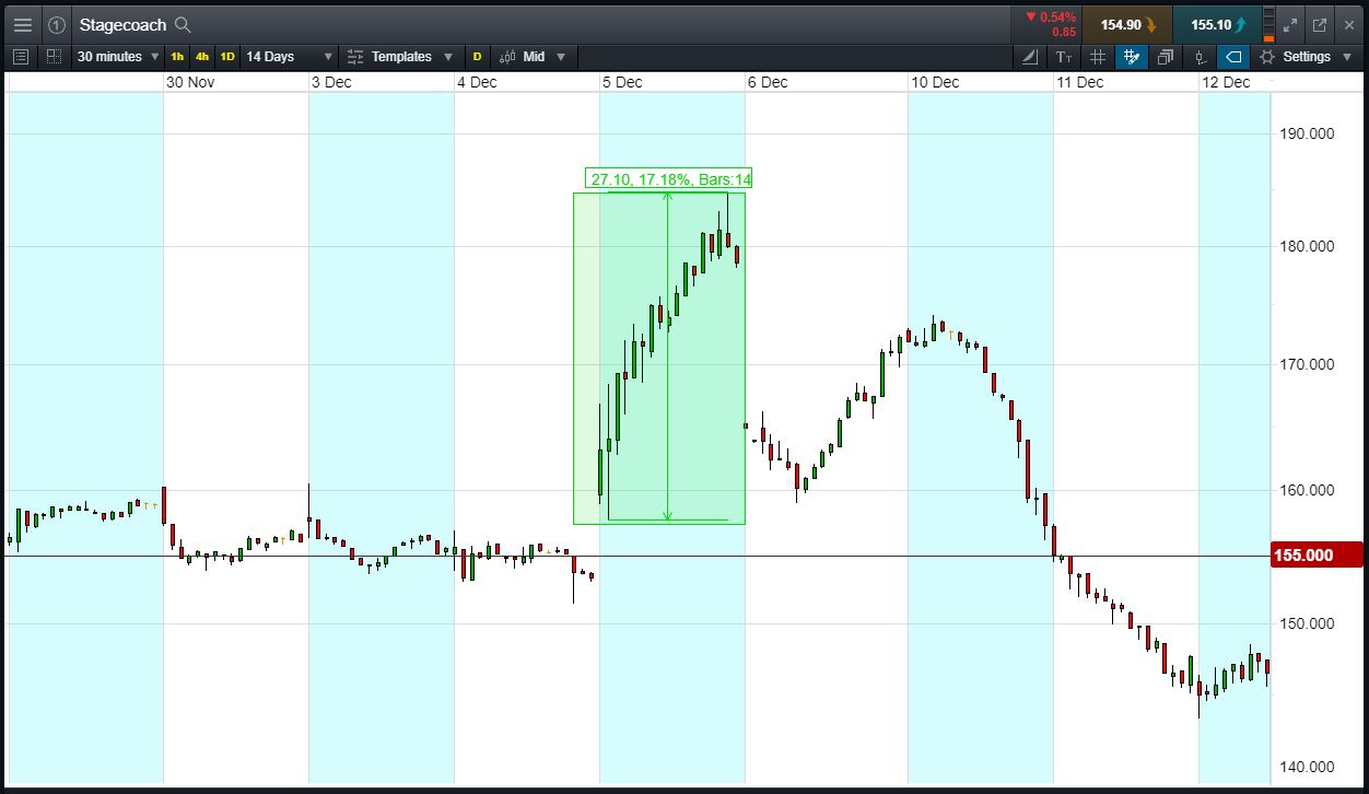 Let’s say you think that Stagecoach results are likely to be good, and the share price is likely to rise. You decide to buy exposure to £10,000 worth of Stagecoach using CFDs, at the current price of 155p. To do this, you need £2,000.
