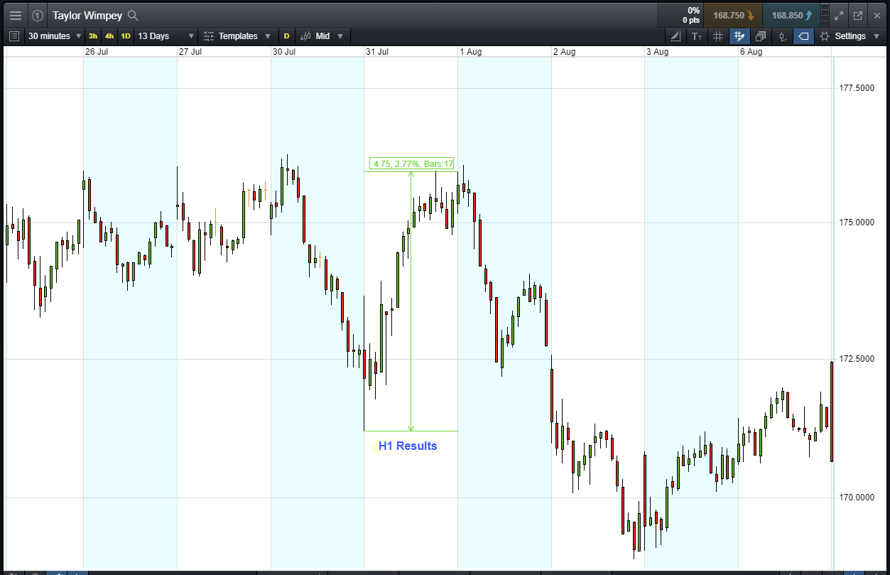 - The chart shows the price movement last time Taylor Wimpey reported: H1 Results, 31 July.