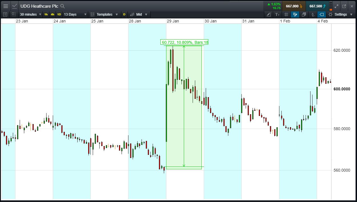 Let’s say you think that UDG Healthcare results are likely to be good, and the share price is likely to rise. You decide to buy exposure to £10,000 worth of UDG Healthcare using CFDs, at the current price of 667p. To do this, you need £2,000.