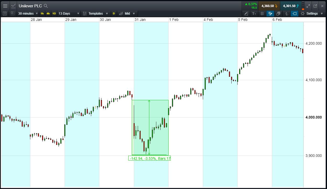 Let’s say you think that Unilever results are likely to be good, and the share price is likely to rise. You decide to buy exposure to £10,000 worth of Unilever using CFDs, at the current price of 4364p. To do this, you need £2,000.