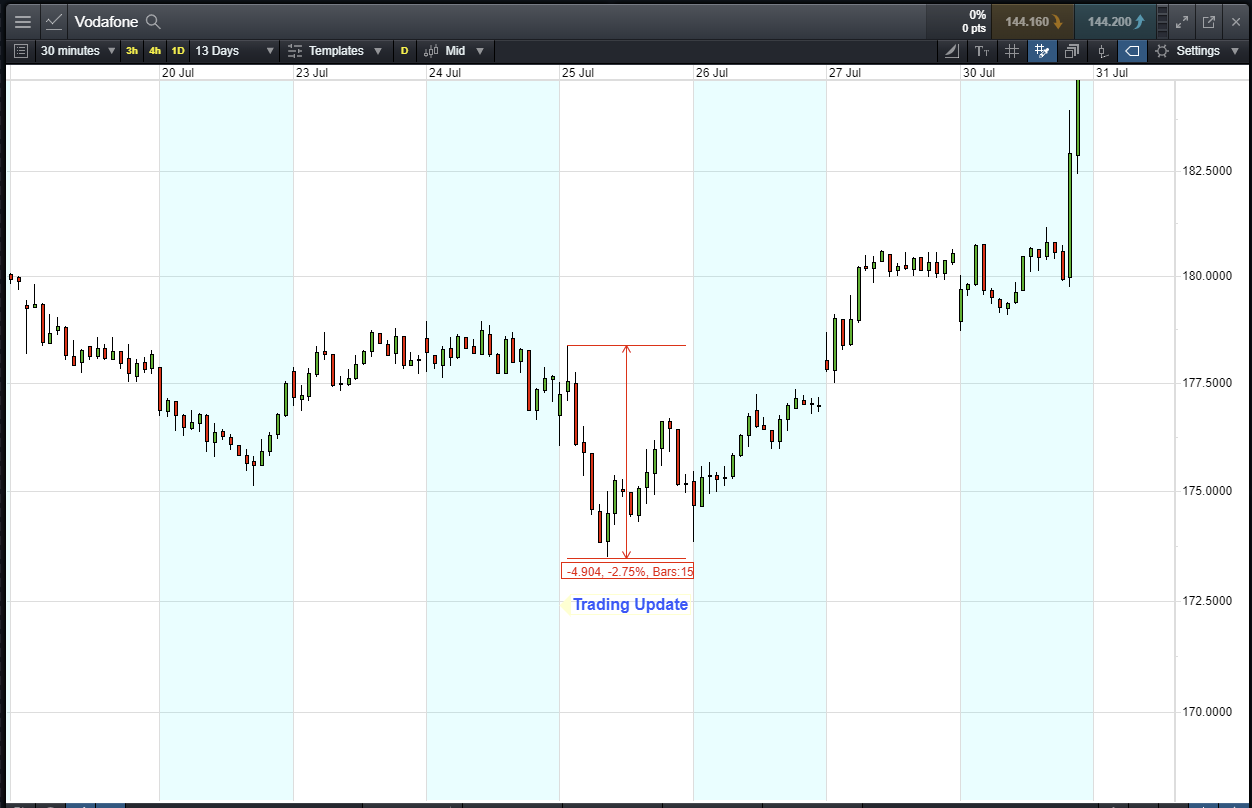 - The chart shows the price movement last time Vodafone reported: Q1 Trading Update, 25 July.