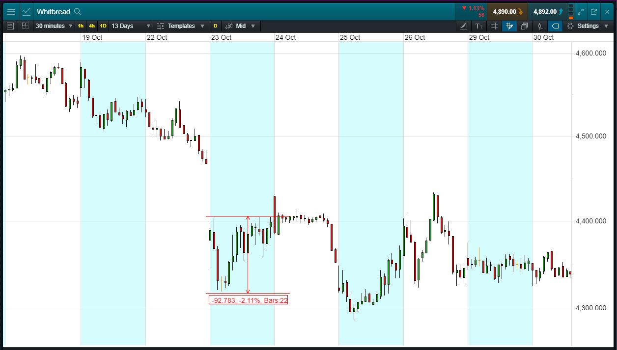 - The chart shows the price movement last time Whitbread reported: H1 Results, 23 Oct