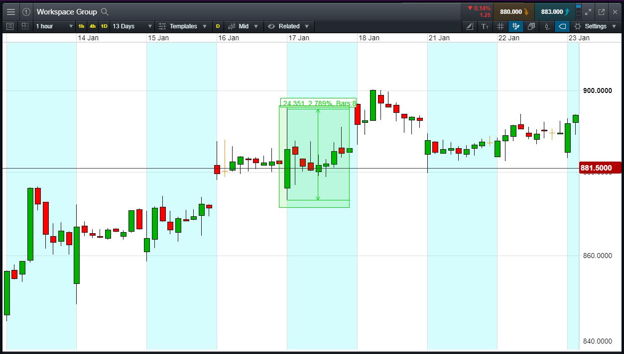 Let’s say you think that Workspace results are likely to be good, and the share price is likely to rise. You decide to buy exposure to £10,000 worth of Workspace using CFDs, at the current price of 881p. To do this, you need £2,000.